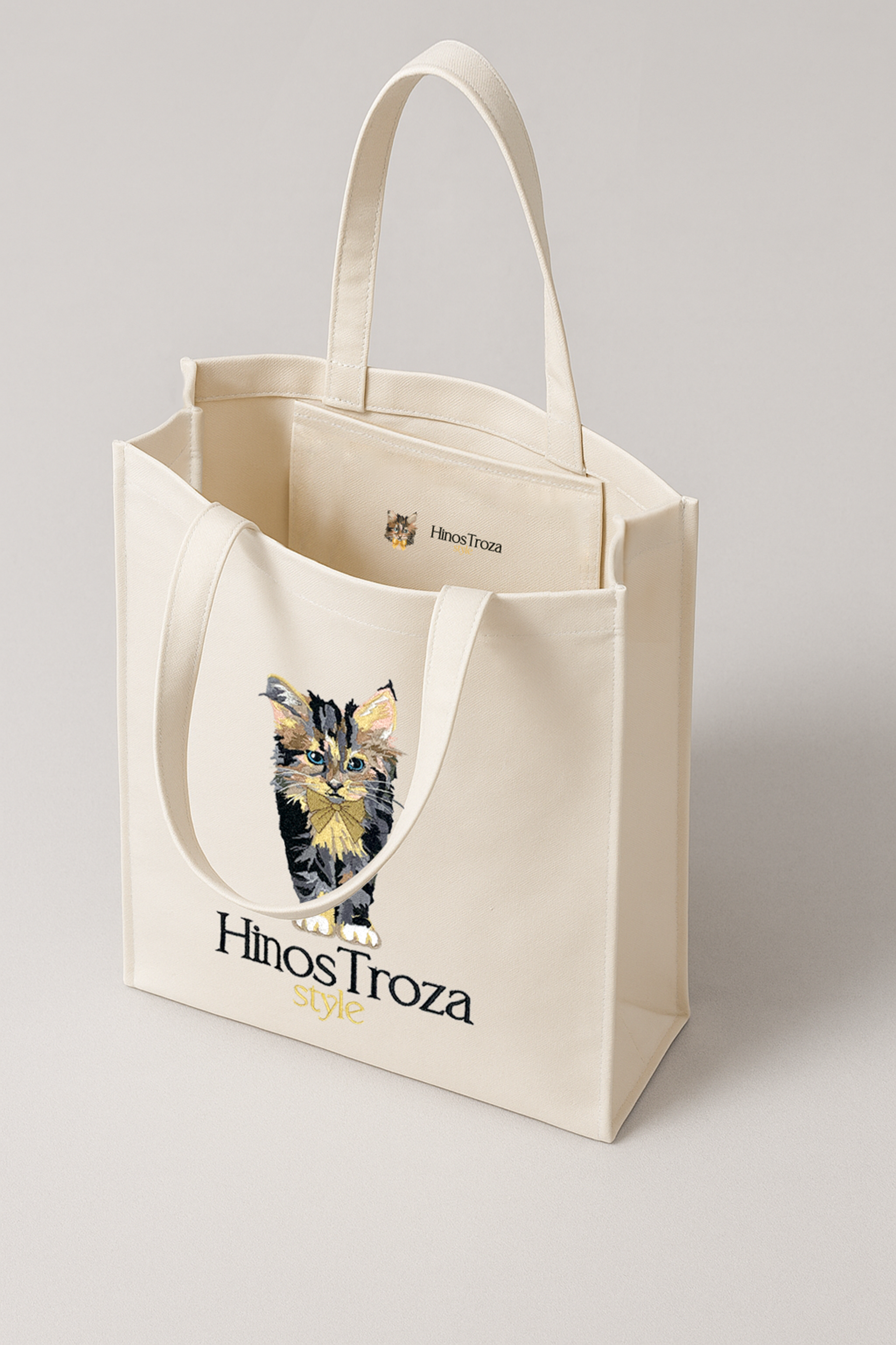 Luce tu personalidad con elegancia y encanto con nuestro exclusivo bolso tote bordado HinosTroza Style . Con un gato y el logotipo de la marca finamente bordados, este bolso combina con estilo moda y arte textil.